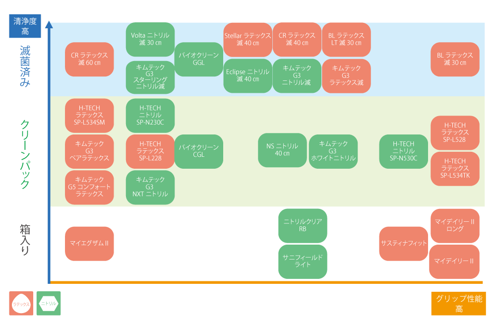 ・清浄度、及びグリップ力で手袋の特長をマッピングしています。